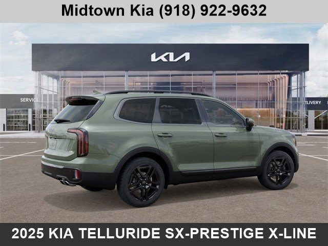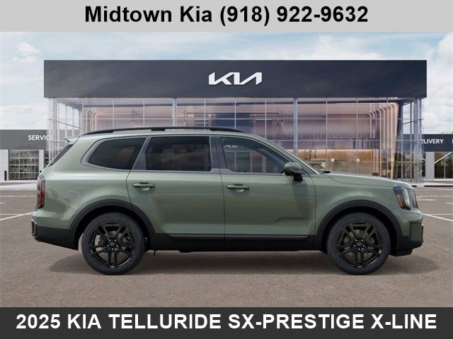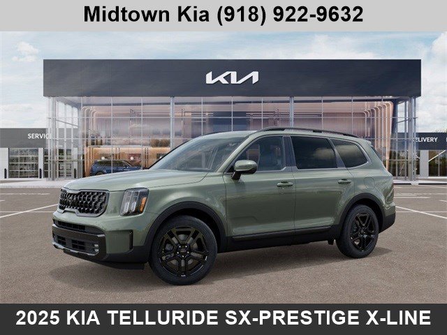 Located at our Kia dealership in Tulsa, this Jungle Green Kia Telluride is a new 2025 Kia Telluride SX-Prestige X-Line AWD SUV, and is complimented with a beautiful, Terracotta Nappa Leather interior seat trim.