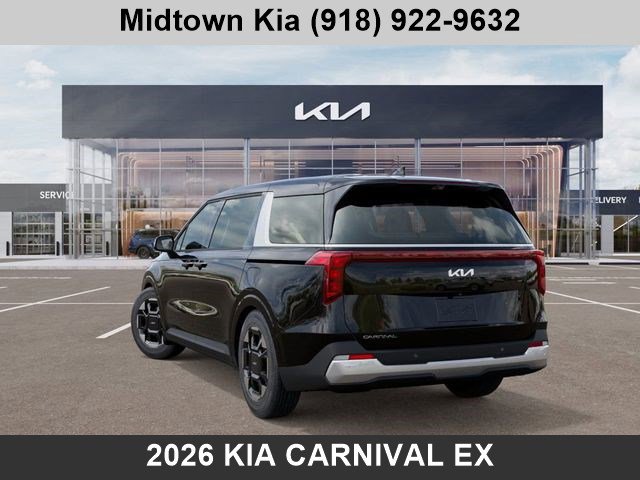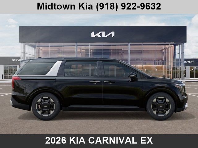 Located at our Tulsa Kia dealership, this Aurora Black Pearl Kia Carnival, is a new 2026 Kia Carnival EX MPV, and is complimented with a beautiful, Off-Black & Umber Two-Tone SynTex interior seat trim.