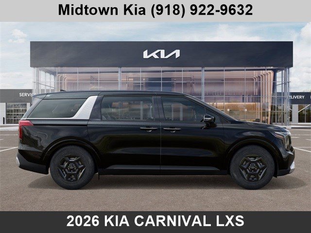 Located at our Kia dealership in Tulsa, this Aurora Black Pearl Kia Carnival, is a new 2026 Kia Carnival LXS MPV, and is complimented with a beautiful, Off-Black & Taupe Two-Tone SynTex Interior Seat Trim.