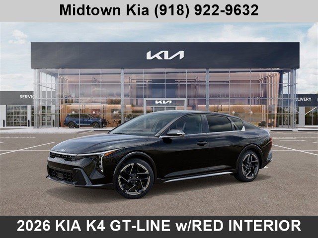 Located at our Kia dealership in Tulsa, this Aurora Black Pearl K4, is a New 2026 Kia K4 GT-Line Sedan, and is complimented with a beautiful, Black & Red Interior SynTex seat trim.