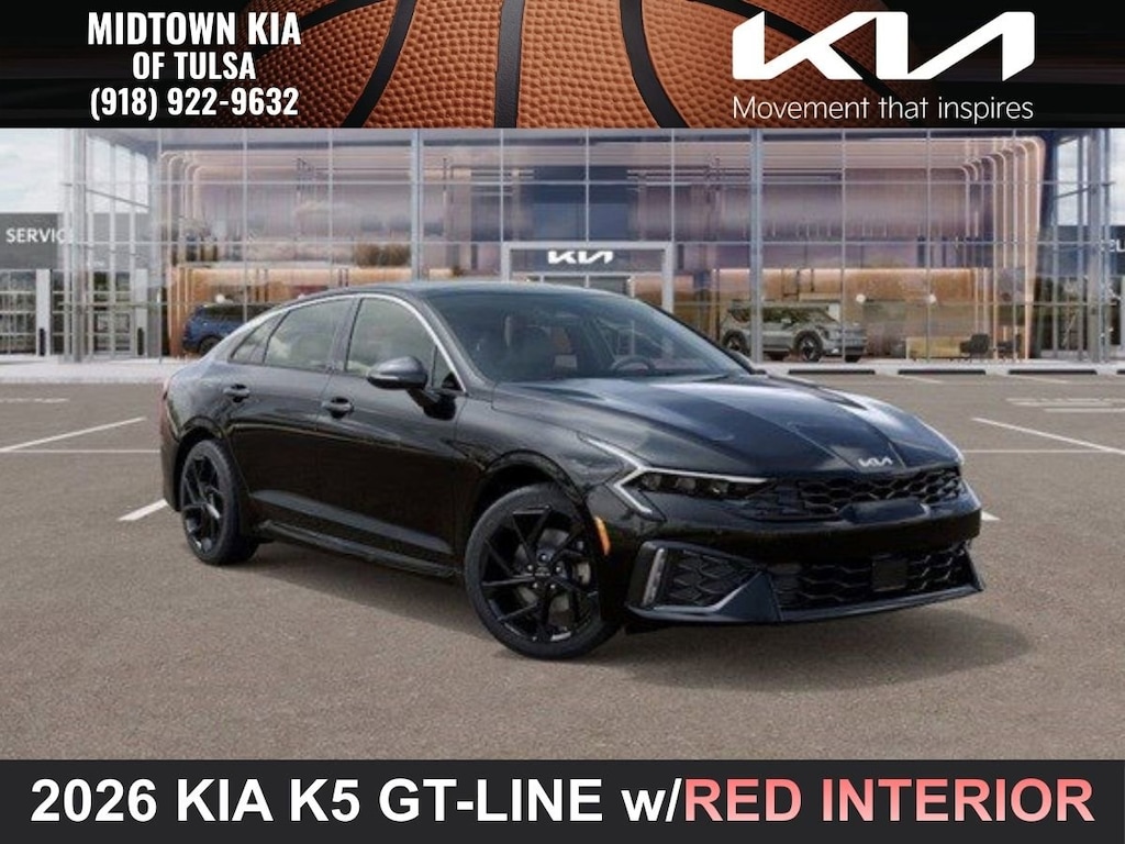 Located at our Kia dealership in Tulsa, this Aurora Black Pearl Kia K5 is a New 2026 Kia K5 GT-Line FWD Sedan, and is complimented with a beautiful, Red Interior SynTex Seat Trim.