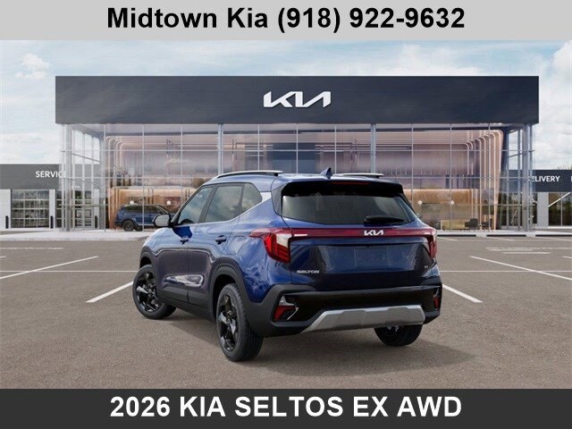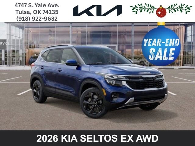 Located at our Kia Dealership in Tulsa, this Dark Ocean Blue Kia Seltos, is a New 2026 Kia Seltos EX AWD SUV, and is complimented with a beautiful, Brown SynTex Interior Seat Trim.