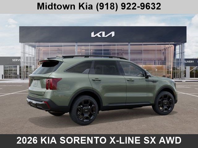 Located at our Tulsa Kia dealership, this Jungle Green Kia Sorento, is a New 2026 Kia Sorento X-Line SX AWD SUV, and is complimented with a beautiful, Black SynTex Interior Seat Trim.