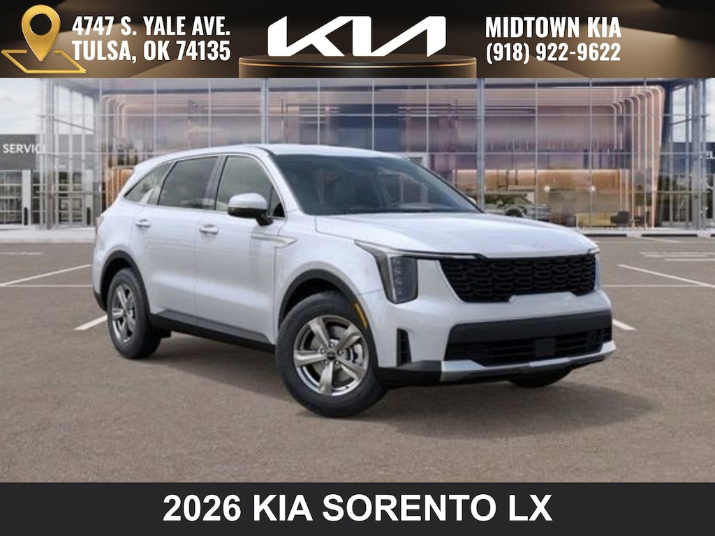 Don't miss out! Contact one of your friendly consultants today at Midtown Kia of Tulsa, at (918) 922-9632, for complete details on this 2026 Kia Sorento. Tulsa, Broken Arrow and Oklahoma City Kia clients, are always invited to discover our convenient and hassle-free car-buying experience, here at Midtown Kia, where "We're always glad to see ya!" Price does not include documentation fee. Price includes: $2500 - Kia Customer Cash. Exp. 05/04/2026