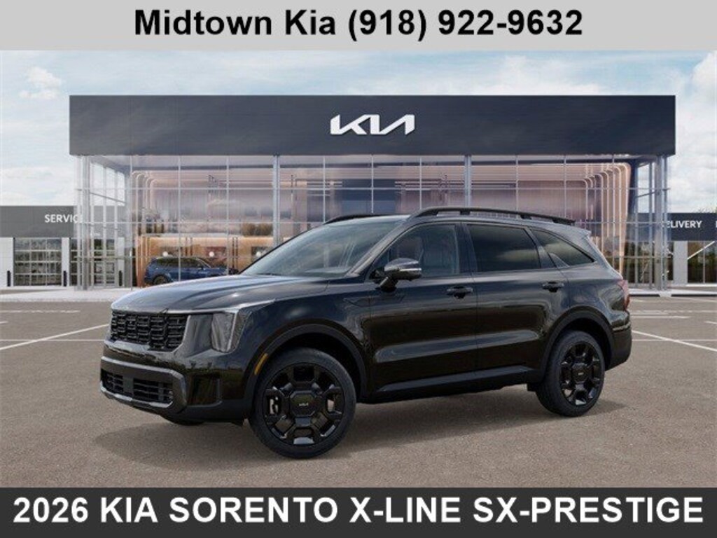 Located at our Kia dealership in Tulsa, this Ebony Black Kia Sorento, is a new 2026 Kia Sorento X-Line SX Prestige AWD SUV, and is complimented with a beautiful Black Leather Interior Seat Trim.