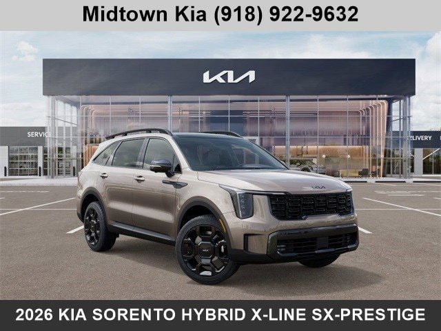 Located at our Kia dealership in Tulsa, this Volcanic Sand Kia Sorento Hybrid, is a new 2026 Kia Sorento Hybrid X-Line SX Prestige AWD SUV, and is complimented with a beautiful Black Leather Interior Seat Trim.