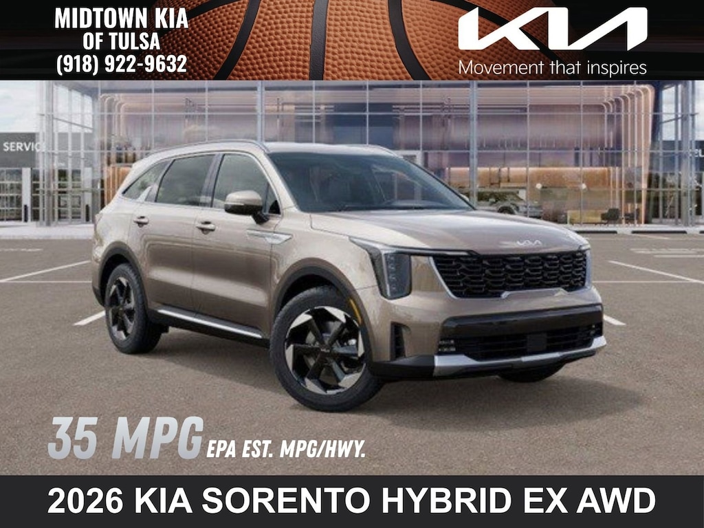 2026 KIA SORENTO HYBRID EX AWD. 32/35 City/Highway MPG 1.6L Turbo GDI 4-Cylinder. 1.6L Turbo GDI 4-Cylinder 6-Speed Automatic AWD