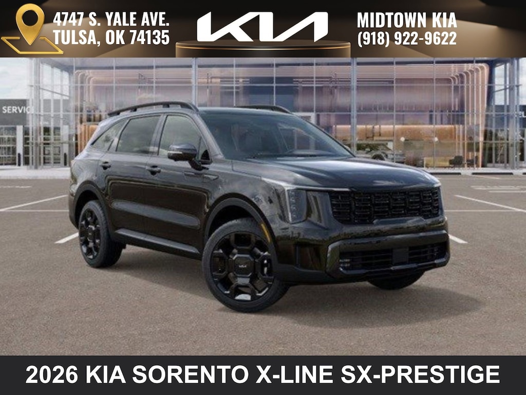 Located at our Kia dealership in Tulsa, this Ebony Black Kia Sorento, is a new 2026 Kia Sorento X-Line SX Prestige AWD SUV, and is complimented with a beautiful Olive Brown Leather Interior Seat Trim.