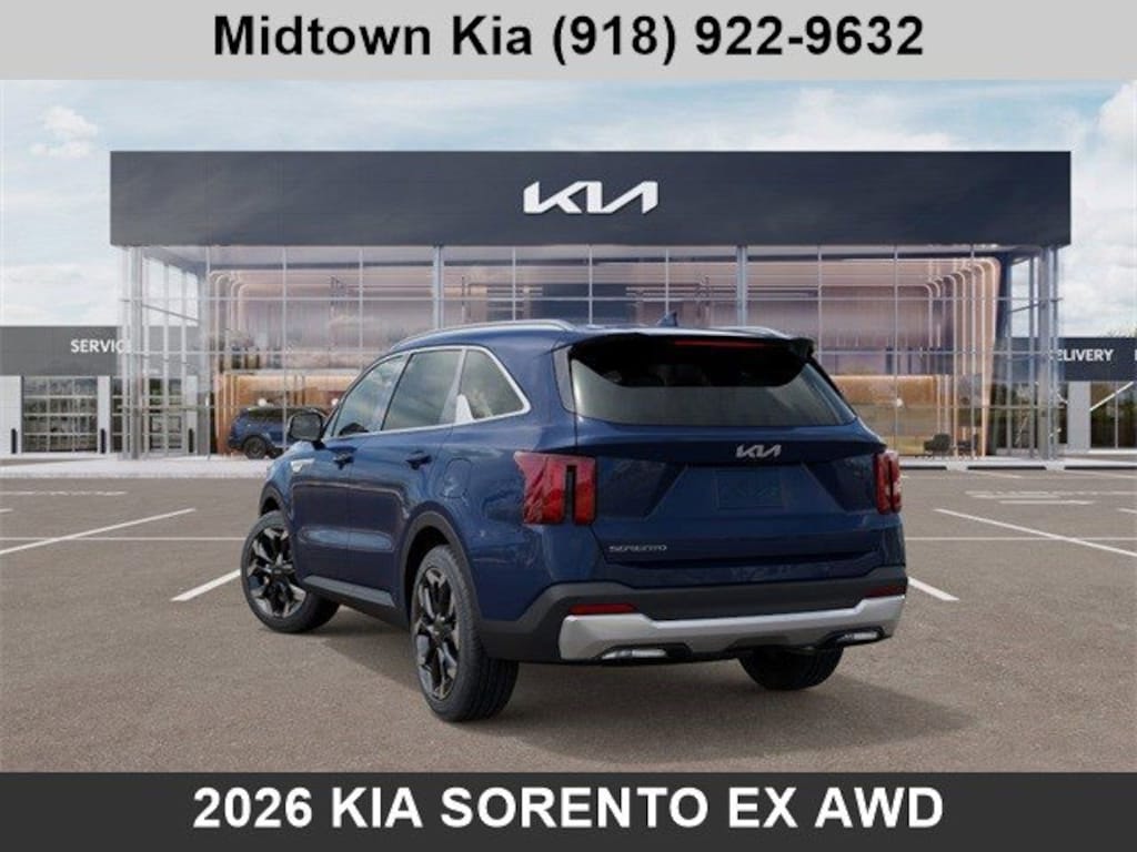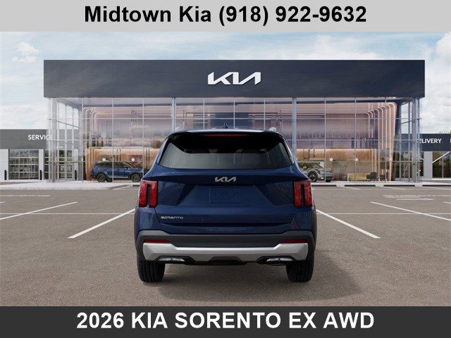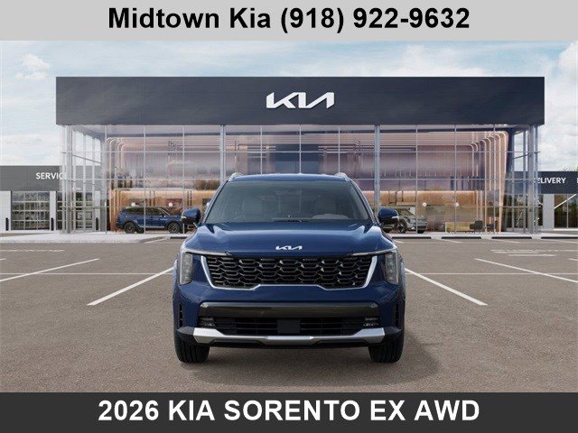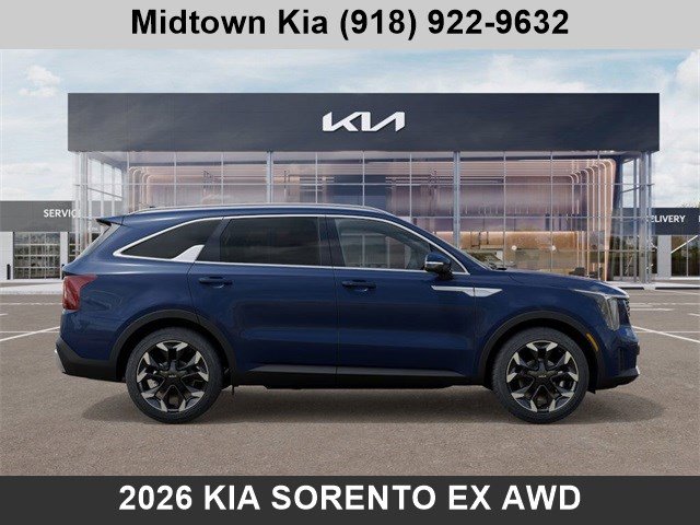 Located at our Kia Dealership in Tulsa, this Midnight Lake Blue Kia Sorento, is a New 2026 Kia Sorento EX AWD SUV, and is complimented with a beautiful, Black SynTex Interior Seat Trim.