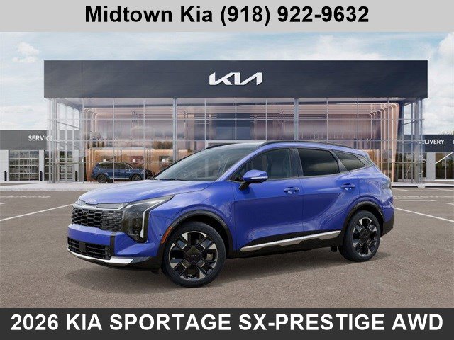 Located at our Tulsa Kia dealership, this Nebular Blue Kia Sportage, is a New 2026 Kia Sportage SX-Prestige AWD SUV, and is complimented with a beautiful, Perforated and Quilted Saturn Black SynTex seat trim.