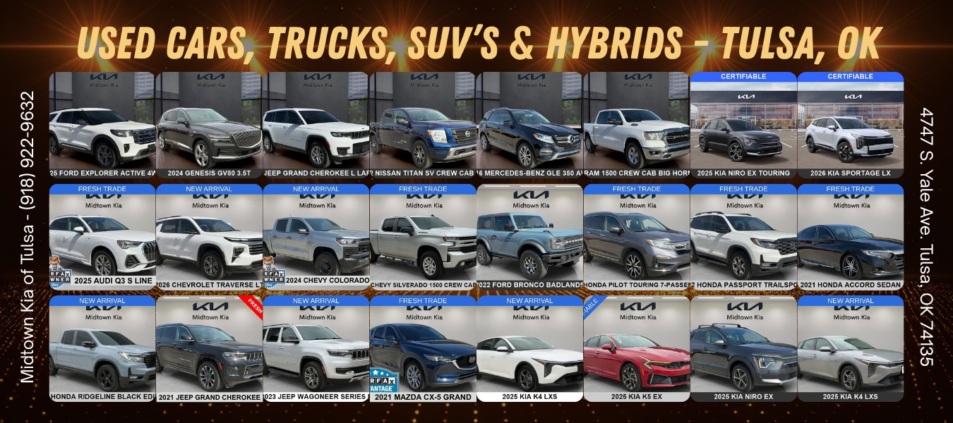 If you're searching for Tulsa used cars, then don't miss these out on these used car deals at Midtown Kia of Tulsa. Right now, choose from over 50 quality used cars for sale, from 14 different manufacturers. Shop Used Cars, Tulsa!