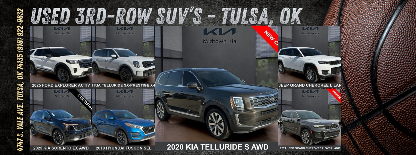 If You're Searching for a Quality Used 3rd-Row SUV for Sale in Tulsa, OK, Then Take Your Pick from nearly a Dozen Quality Used 3rd-Row SUV's from Midtown Kia of Tulsa. Right Now, Choose from Chevrolet, Ford, Honda, Jeep (3), Kia (2), Nissan or Subaru.