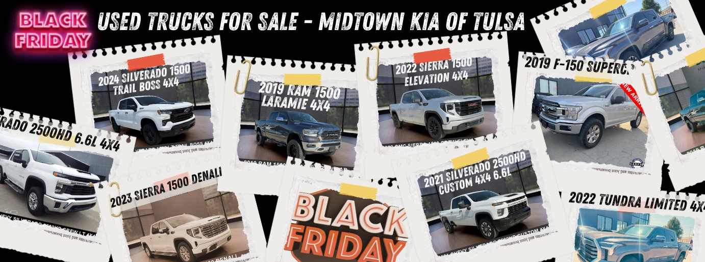 If you're searching for quality, used trucks for sale in Tulsa, OK, then don't miss out on our Used Truck Liquidation... happening right now here at Midtown Kia of Tulsa. Choose from several quality Used Chevy Silverado 1500 and 2500HD models, Used Ford F-150, GMC Sierra 1500 or Canyon, Jeep, Nissan, Toyota Tundra or Tacoma and RAM Full-Size Trucks at Midtown Kia of Tulsa.