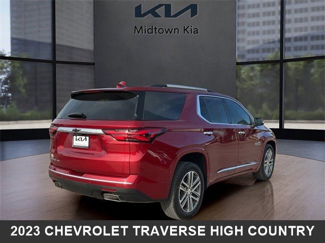 Located at our Kia dealership in Tulsa, this Radiant Red Chevy Traverse, is a Used 2023 Chevrolet Traverse High Country AWD SUV, and is complimented with a beautiful, Jet Black/Clove interior seat trim.