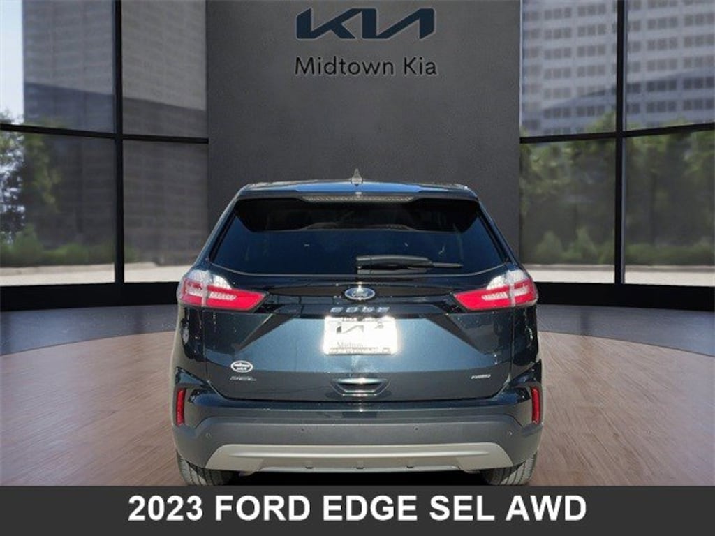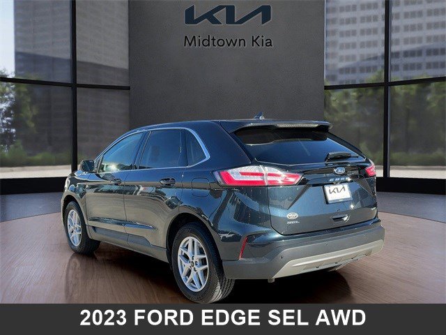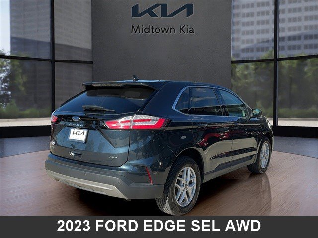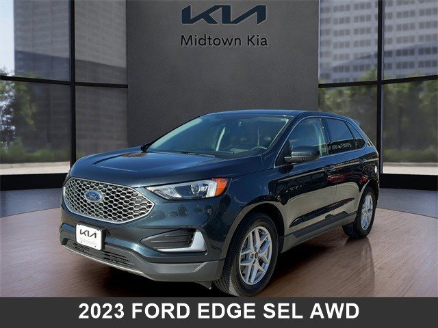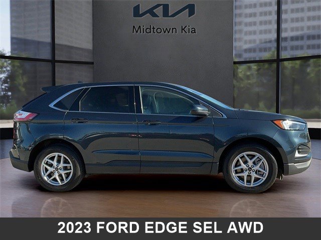 Located at our Kia dealership in Tulsa, this Stone Blue Metallic Ford Edge, is a Used 2023 Ford Edge SEL AWD SUV, and is complimented with a beautiful, Ebony interior seat trim.