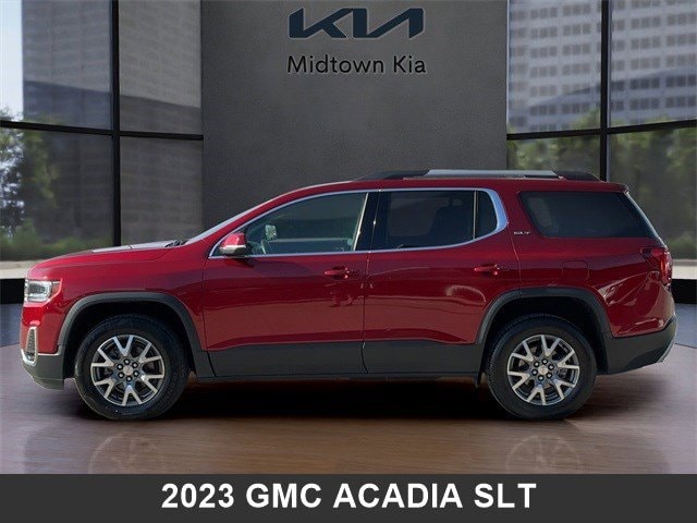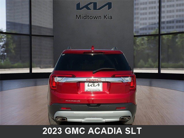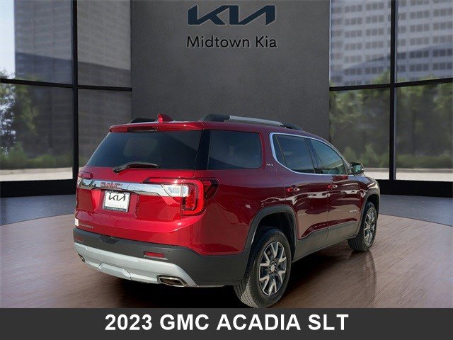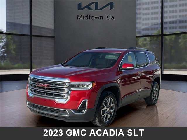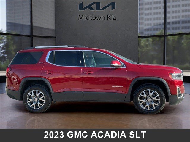 Located at our Kia dealership in Tulsa, this Volcanic Red GMC Acadia, is a used 2023 GMC Acadia SLT FWD SUV, and is complimented with a beautiful, Gray interior seat trim.