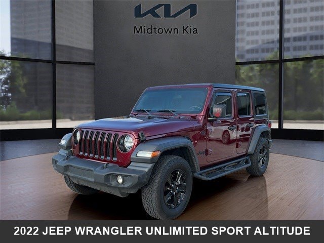 Located at our Kia dealership in Tulsa, this Snazzberry Pearl Jeep Wrangler, is a Used 2022 Jeep Wrangler Unlimited Sport Altitude 4WD SUV, and is complimented with a sweet, Black interior seat trim.